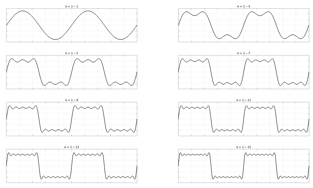 また,この成分の正弦波を順に足し合わせていくと,だんだんと矩形波の形が現れることが分かります(fig.4).なお,級数展開なので,有限回足し合わせても,矩形波が現れることはありません.